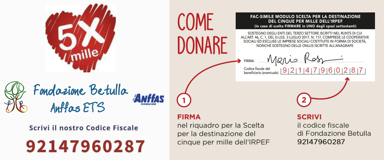 Sostieni la Fondazione Betulla Anffas ETS nei suoi progetti, i nostri “ragazzi”, i sogni di ognuno. Per destinare il 5 per mille alla FONDAZIONE BETULLA ANFFAS ETS basta scrivere il codice fiscale